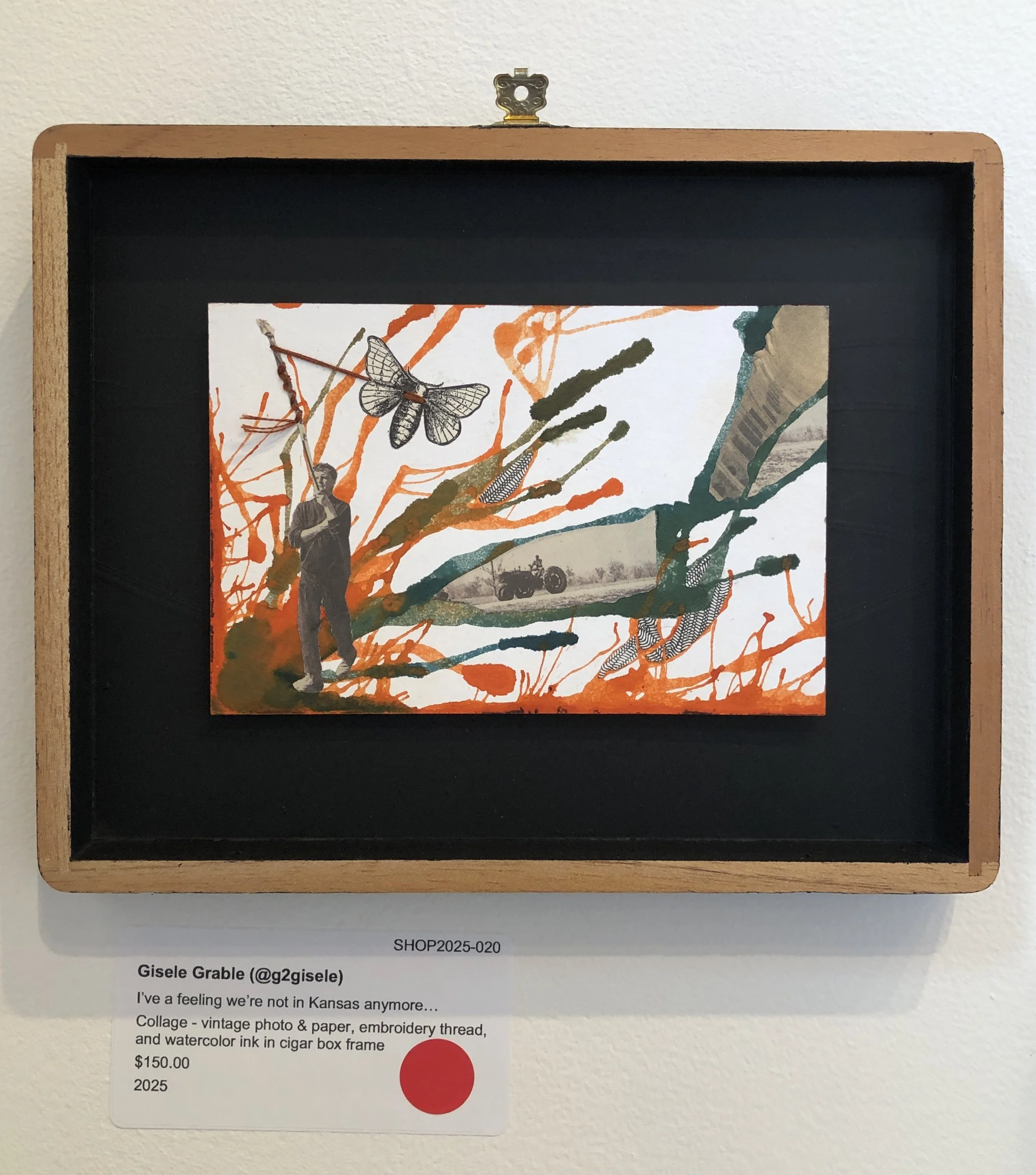 collage assemblage - vintage photo and paper, embroidery thread and watercolor ink in cigar box frame