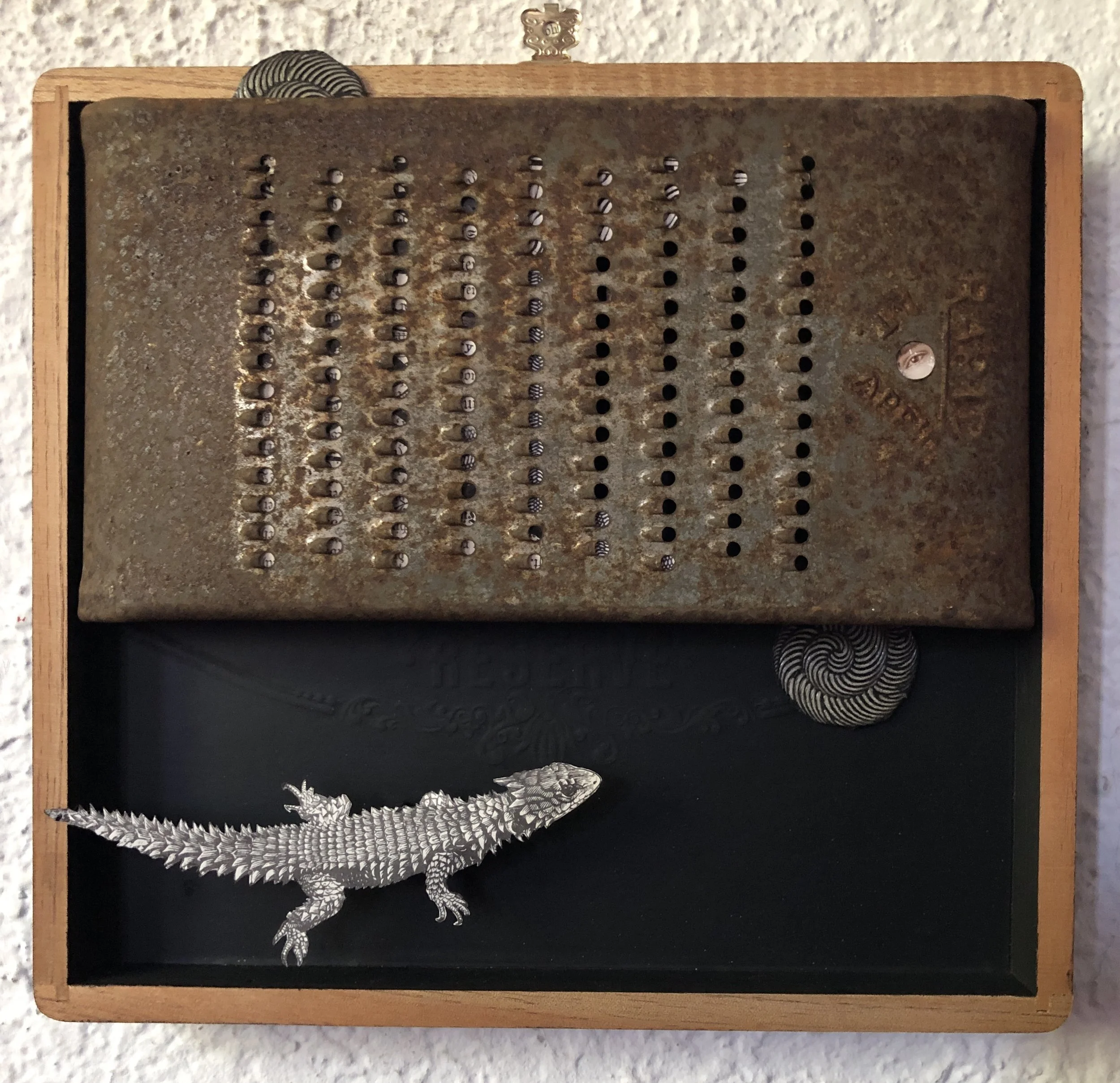 collage assemblage with vintage photo, paper and metal in cigar box frame